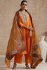 Orange embroidered kurta with tassel detailing on sleeves paired with matching pants.