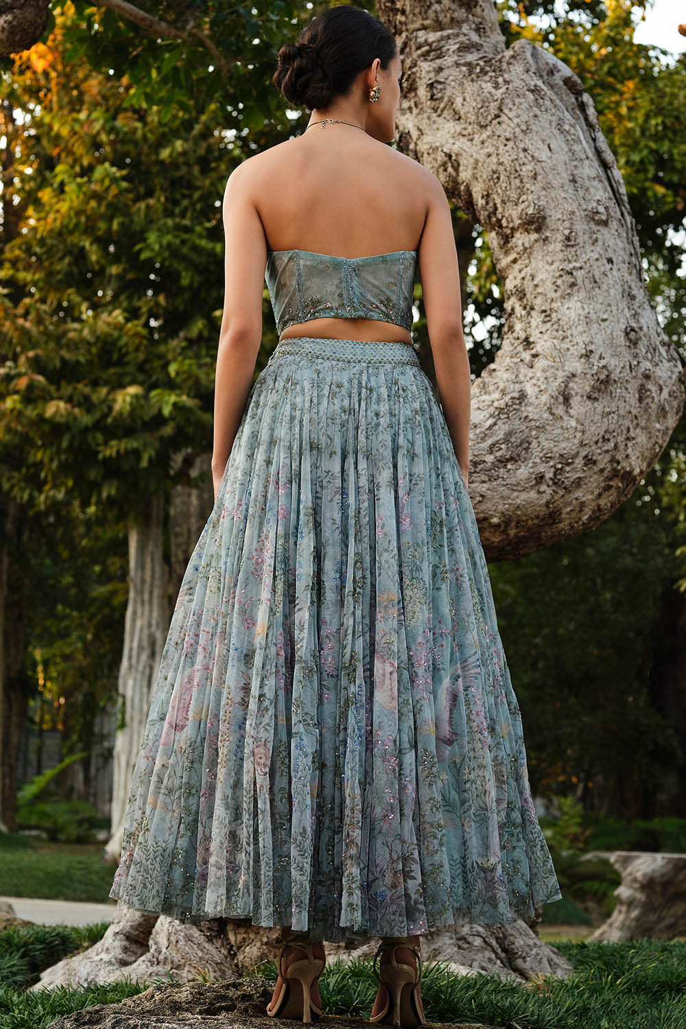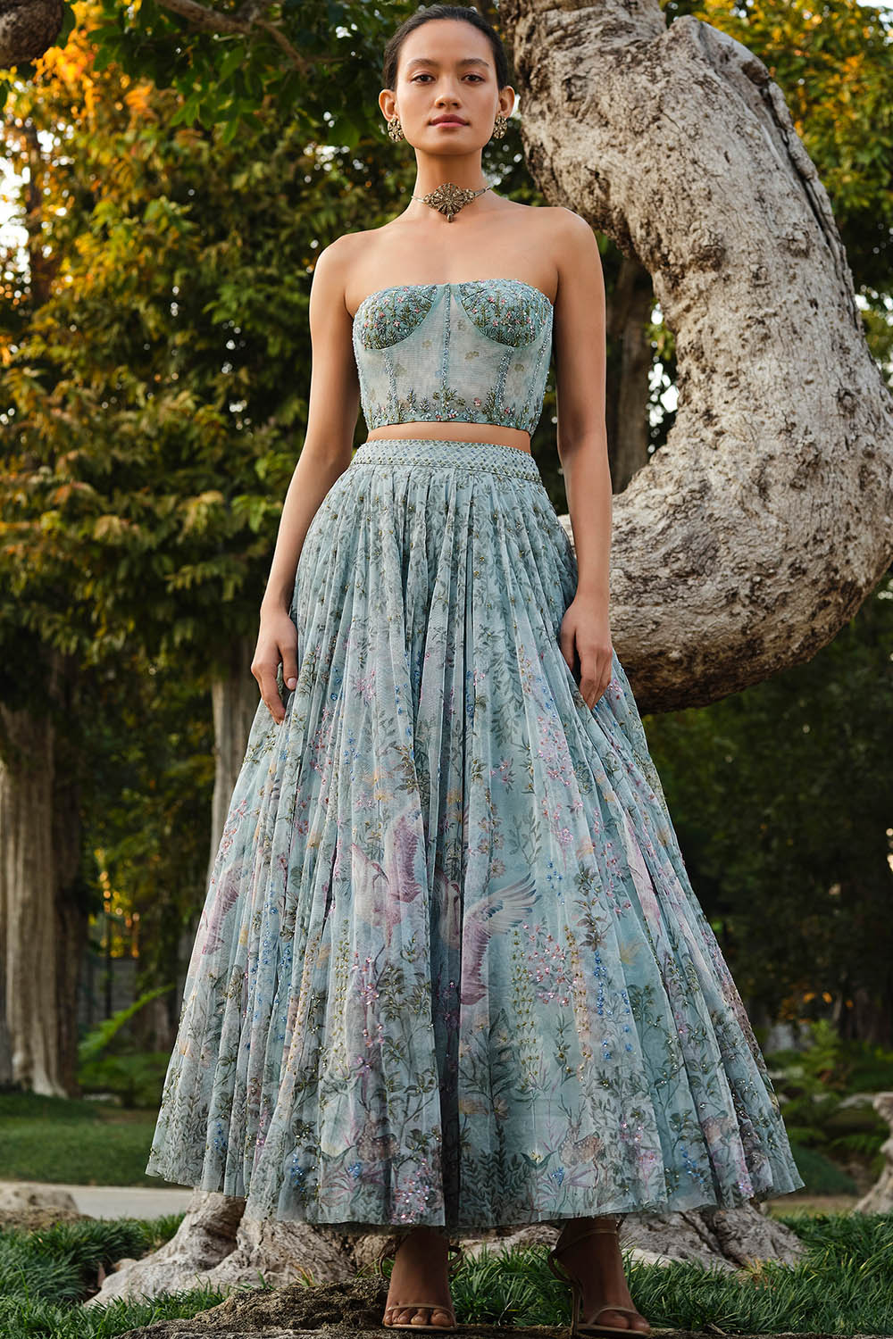 A dreamscape immersed in nature's bounties makes Belinay perfect for summer weddings. Crafted with a structured bodice and ankle-length skirt, this ensemble is elevated in sequins.