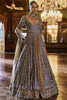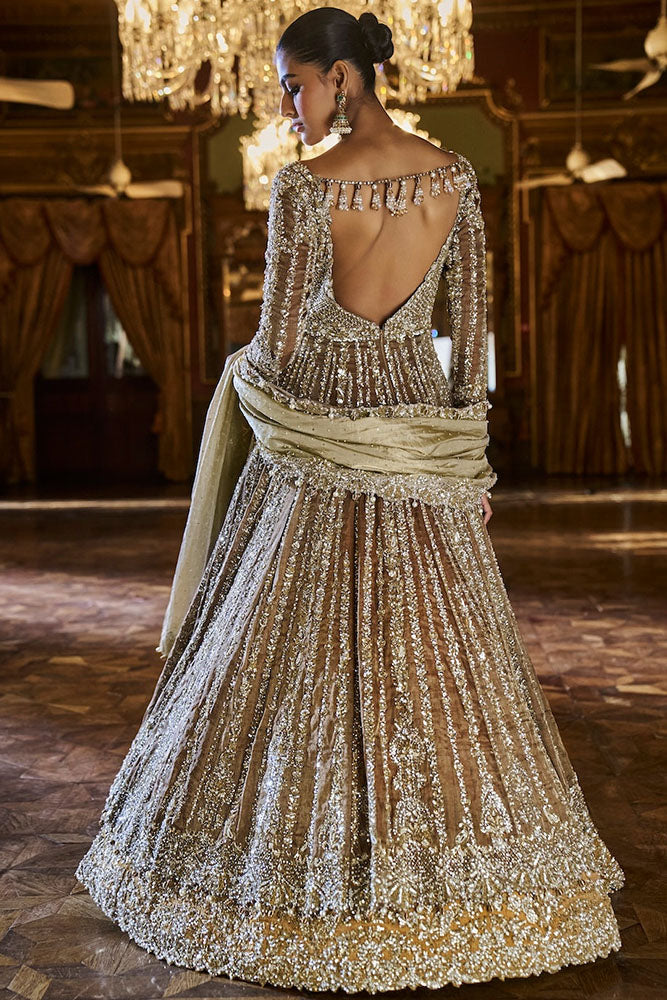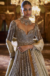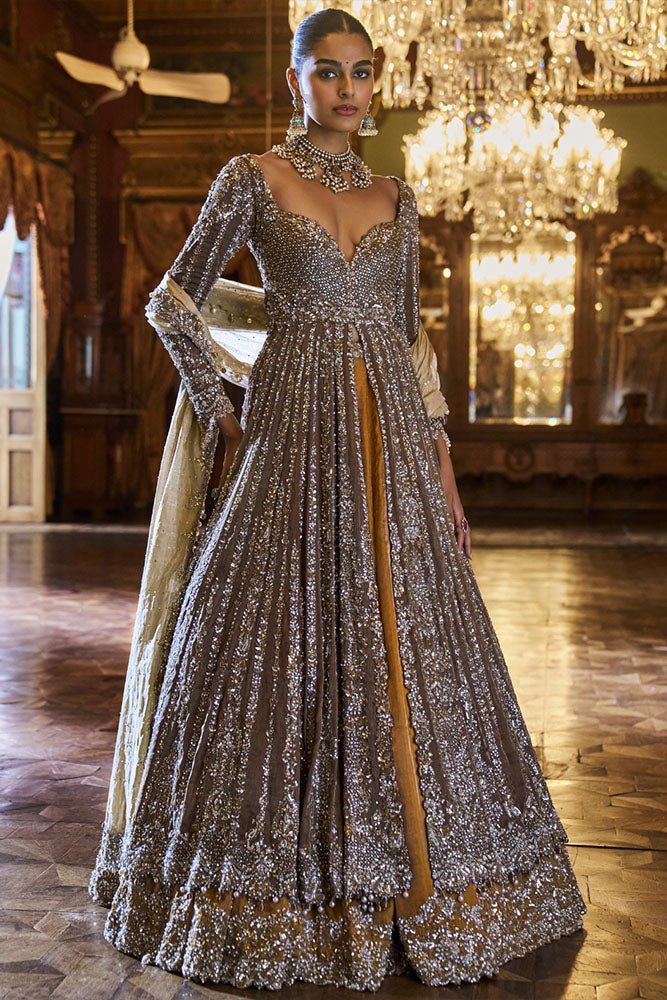 This set features a coffee brown jacket in tissue silk with delicate embroidery with bugle beads, sequin and crystal. The lehenga is in contrasting deep mustard lehenga has a broad border at the bottom. The slate tissue dupatta has a cut work border on all four sides