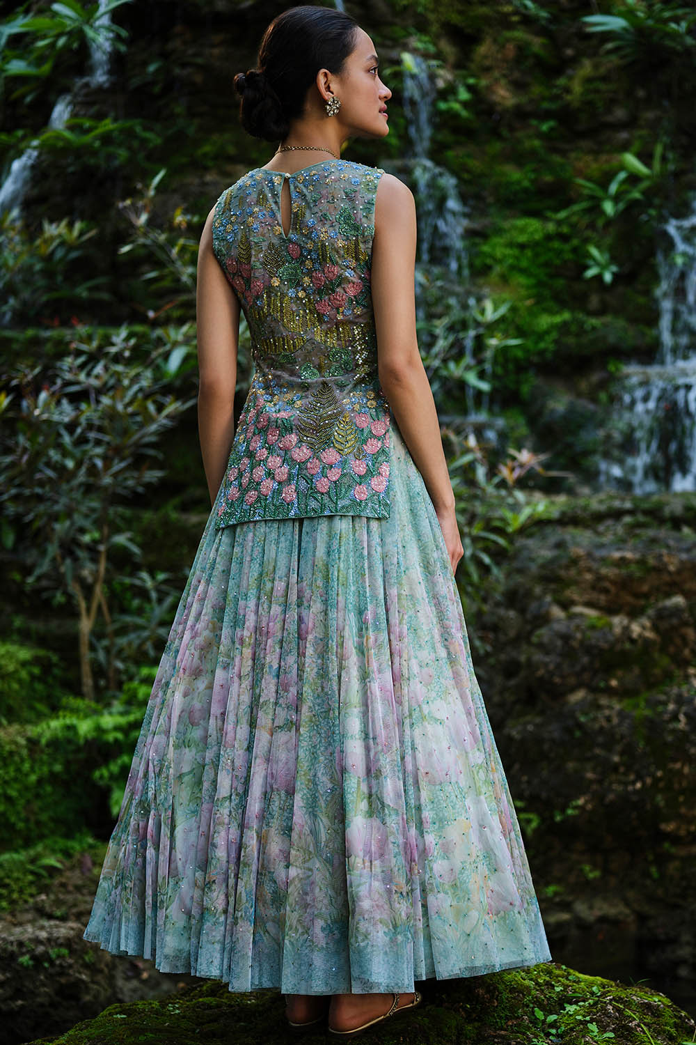 A memory of painterly florals and tranquil plains is evoked with our Isla skirt set. Crafted in a light-as-air and dreamy silhouette, it is elevated in appliqué details, threadwork, beads & sequins. Comes with pockets.