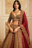 Exude regal elegance in this antique gold and deep maroon lehenga, intricately hand-embroidered with zardozi, resham, sequins, and cutdana work. The skirt is adorned with architectural and floral-inspired motifs, creating a rich tapestry of traditional artistry. The blouse, with its structured sweetheart neckline and ornate embroidery, enhances the grandeur of the ensemble. Completing the look is a sheer maroon dupatta with floral scalloping, adding finesse and grace.Â