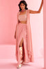 Drape skirt paired with pearl and zardozi embroidered top and embellished georgette jacket.
