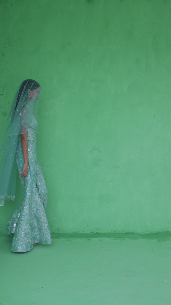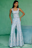 Floral thread and faux metallic leather embroidered halter neck top and flared pant paired with tulle dupatta.
