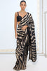 Introducing our pure silk zari saree in black and silver, handwoven over hours in the traditional Kadhwa Banarasi technique. Designed in bold, zebra-inspired stripes and finished with silver zari, it is lightweight, fluid, and perfect for festivities or special occasions.