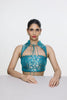 The Coral Blue blouse is handwoven in pure satin using the Kadhwa Banarasi technique. Featuring a square neckline with a mandarin collar and tie-up detail, its intriguing cut makes it a statement piece on its own.