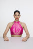 The halter-neck blouse in Fuchsia pink is handwoven in satin using the Kadhwa Banarasi technique. With its sleek halter-neck silhouette, it offers a modern take on traditional craftsmanship.