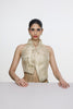 The Ivory-Gold Blouse is handwoven in pure satin using the Kadhwa Banarasi technique. Featuring asymmetric waistcoat-like flaps with tie-up detailing and a mandarin collar, it’s a modern twist on traditional craftsmanship.