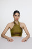 The asymmetric halter-neck blouse is handwoven in pure satin using the Tanchoi Banarasi technique. Featuring a deconstructed halter-neck silhouette with striking cuts in olive green, it offers a contemporary twist on tradition.