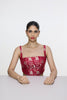 The corset-style blouse in Rose Red is handwoven in satin using the Kadhwa Banarasi technique. Featuring a structured silhouette with a square neckline, it’s a contemporary twist on classic craftsmanship.