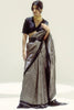 This black signature is handwoven in satin-silk and comes sprinkled with gold zari in an intricate houndstooth pattern. We suggest adding a touch of glamour with a striking belt or a statement piece of gold jewellery to complete the ensemble.