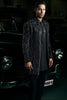 This open sherwani set features intricate embroidery in black bugle beads in an abstract pattern on a black raw silk base. It is paired with a black silk kurta with tonal embroidery in a linear design and straight pants.