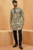 This statement kurta showcases intricate abstract embellishments in navy and gold, exuding a bold yet refined charm. Paired with matching navy trousers, the ensemble offers a perfect blend of comfort and festive elegance.
