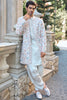 This set features all over thread embroidery in ivory, powder blue, peaches, mauves and sage green tones and highlighted with assorted beads and sequins. It is paired with an embroidered satin kurta and matching afghani salwar.