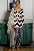 Asfi black & white embroidered chevron velvet kurta and black & white embroidered stripe velvet patiala salwar with 3 dot mukaish organza dupatta.