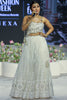 Off white georgette embroidered asymmetric choli and mukaish silkmul sharara attached with chikankari organza lehenga.