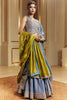 Our Amer tissue skirt in saleti paired with thoroughly embroidered sleeveless koti (waist coat) and dry heena green contrast dupatta with a mix of dabka and salma sitara work. The whole look reminiscing the age old Rajasthan's royalty.