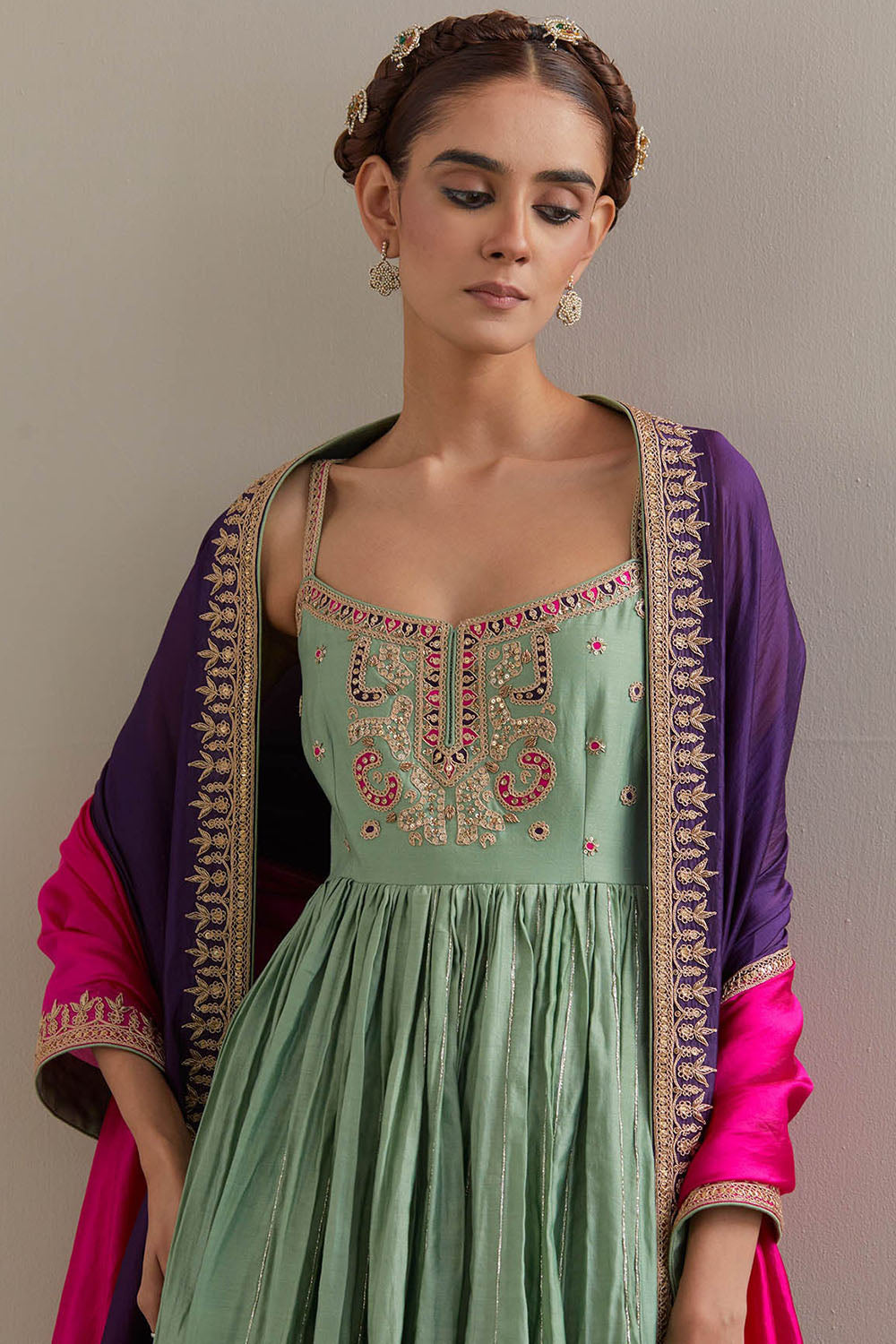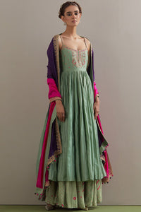 Sage green strappy anarkali paired with printed gharara & silk organza colour block dupatta.