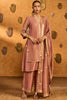 A-line tissue silk kurta set with foil print border and gold embroidery.