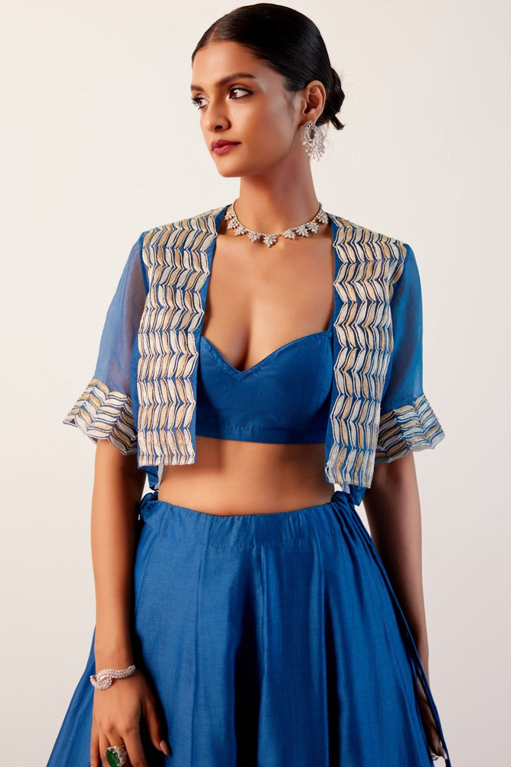 Royal blue silk chanderi lehenga set with gold and silver hand-painted florals with a silk chanderi blouse and a zari embroidered sheer organza short cape.