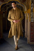 This set features gold zari embroidery on an antique gold tissue silk base. The ensemble is paired with a beige cotton silk kurta and churidar. The tissue organza dupatta has a matching embroidered border on all four sides.