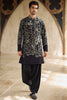 This kurta set features intricate silver zari embroidery on an italian crepe base. The outfit is paired with a matching silk afghani salwar. Complementing stole and footwear is also available.
