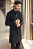 This black sherwani set features tonal thread embroidery on the cuffs and a stepper collar detail on an italian crepe base. This ensemble is paired with a matching crepe kurta and straight pants.