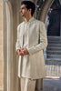 This set features ivory dori embroidery in a linear pattern. The ensemble is paired with a fully embroidered kurta and matching straight pants. Complementing footwear is also available.