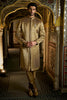 This sherwani set features all over metallic gold and copper thread embroidery in bold abstract pattern on a raw silk base. It is paired with matching textured silk kurta and churidar.
