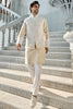 This set features cut work embroidery on a nude base on the bundi. The matching silk kurta shows lace embroidery on the sleeve hem. It is paired with an ivory straight pants.