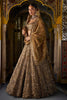 This lehenga set features intricate embroidery in antique gold tones on an organza base. The lehenga is embroidered in minute sequins, bugle beads and crystals in a scalloped pattern. The cap sleeves blouse has a broad neckline and tassels at sleeve hem and waist. It is paired with an embroidered tissue organza dupatta with exaggerated tassels on all four sides.