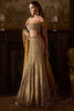 This skirt set features tone on tone embroidery in sequins, beads and bold cut crystals in a linear pattern on an antique gold base. The embroidered off shoulder blouse is paired with a trail skirt matching embroidered dupatta with delicate crystal drops on all four sides.