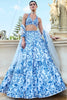 This lehenga set features cobalt blue floral applique motifs embroidery on a white net base and highlighted with assorted sequin and delicate stones. The embroidered halter cut blouse has a back bow along with tassels at the waist. It is paired with a matching embroidered dupatta.
