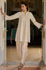 This cream dhoti set features tonal thread, sequin, and pearl embroidery in a geometric pattern. The full sleeves top shows pearl tassels at the wrist as well as at the hem. It is paired with a matching dhoti and an embroidered dupatta with pearl drops on all four sides.