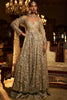 This sharara set features heavy embroidery with cut work in sage green tones. The front open jacket is paired with a crushed tissue green sharara and a matching embroidered dupatta.