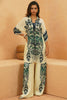 This coord set with a bustier features a breezy, oversized printed tunic paired with wide-leg trousers, both adorned with bold tribal-inspired mask motifs. The deep V-neck tunic, accented with contrasting geometric borders, drapes effortlessly over the intricately patterned bustier, creating a layered, contemporary look. The earthy ivory and navy makes this ensemble perfect for a chic yet relaxed statement.