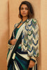 This jacket is a striking statement piece, featuring intricate embellishments in a bold chevron pattern. The mix of metallic accents, beadwork, and textured fabrics in shades of blue, green, silver, and gold creates a rich, luxurious aesthetic. The structured silhouette paired with its heavily adorned surface makes it a perfect fusion of modern glamour and traditional craftsmanship.