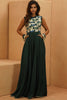 A statement jumpsuit featuring a hand-embroidered bodice and flowing emerald green pants, blending modern elegance with artisanal craftsmanship.