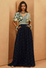 A striking navy jumpsuit featuring an intricately hand-embellished patchwork bodice with a mix of textures, metallic work, and bead detailing. The flowy wide-leg silhouette is adorned with delicate sequins, adding a touch of understated glamour to this fusion ensemble.
