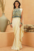 This ethereal ensemble features a soft ivory saree with delicate tassel detailing along the border, exuding understated elegance. The look is elevated with a statement fringe bib in blue and gold, adorned with intricate embroidery and cascading tassels, adding movement and drama. A beige bustier underneath keeps the silhouette sleek, making this a perfect fusion of traditional draping and contemporary embellishments.