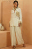 This ivory cord set features a relaxed-fit shirt with a statement fringe pocket in the front and an eye-catching cascading fringe panel at the back. Paired with wide-leg pants adorned with delicate bead detailing, the ensemble exudes effortless elegance with a contemporary edge.