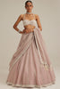 Ash pink linear embroidered organza lehenga paired with a heavily embroidered halter neck blouse and dupatta.