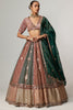 A vibrant multicolor Lehenga in jade green, rust and cranberry tones, adorned with golden gota embroidery, paired with a v neck blouse and jade green dupatta.