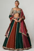 A vibrant multicolor lehenga pants in jade green, rust, and cranberry tones, adorned with linear sequins embroidery, paired with a sweetheart neck blouse and dupatta.
