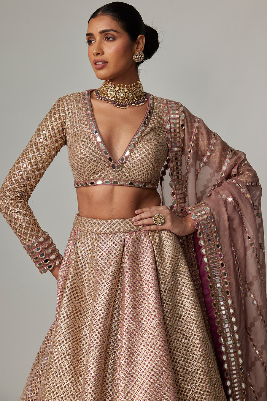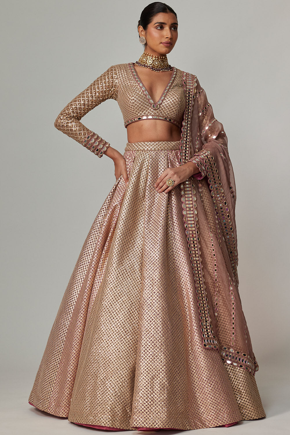 A vibrant multicolor skirt in deep beige, mud mauve, and dark blush tones, adorned with golden gota embroidery, paired with a v neck blouse and dupatta.