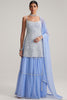 Dew blue mirror and pearl embroidered kurta paired with sharara and dupatta.