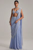 Dew blue fitted georgette saree with cascading pearl tassels paired with a heavily pearl and mirror embroidered blouse.