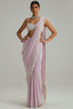 Lavender draped saree set, adorned with mirror and pearl embroidery and cascading pearl tassels, paired with a heavily embroidered blouse.
