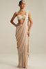 Light beige draped saree set, adorned with mirror and pearl embroidery and cascading pearl tassels, paired with a heavily embroidered blouse.