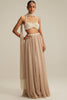 Light beige lehenga pants paired with mirror and pearl embroidered halter neck blouse and dupatta with cascading pearl tassels.