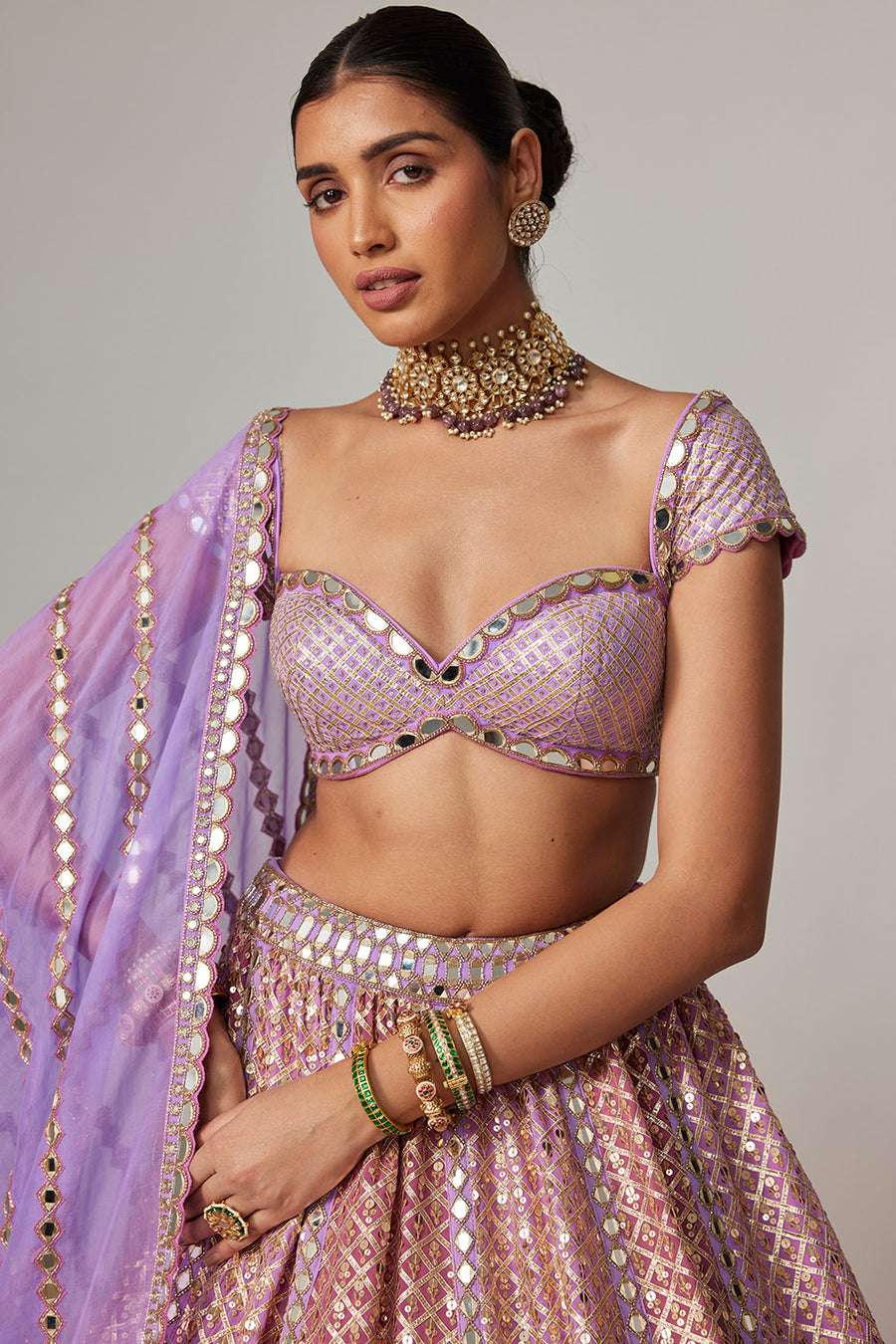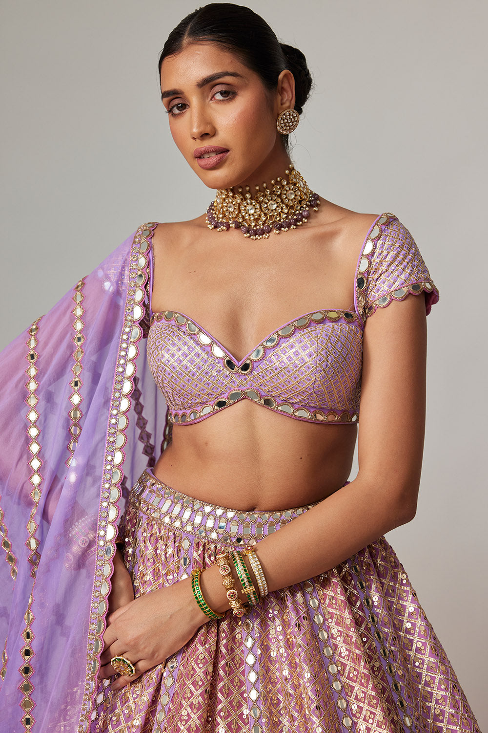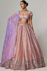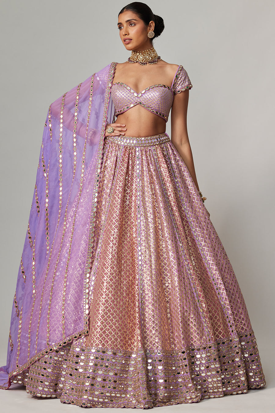 A vibrant multicolor Lehenga in mauve, lilac and dark blush tones, adorned with golden gota embroidery, paired with a cap sleeves blouse.